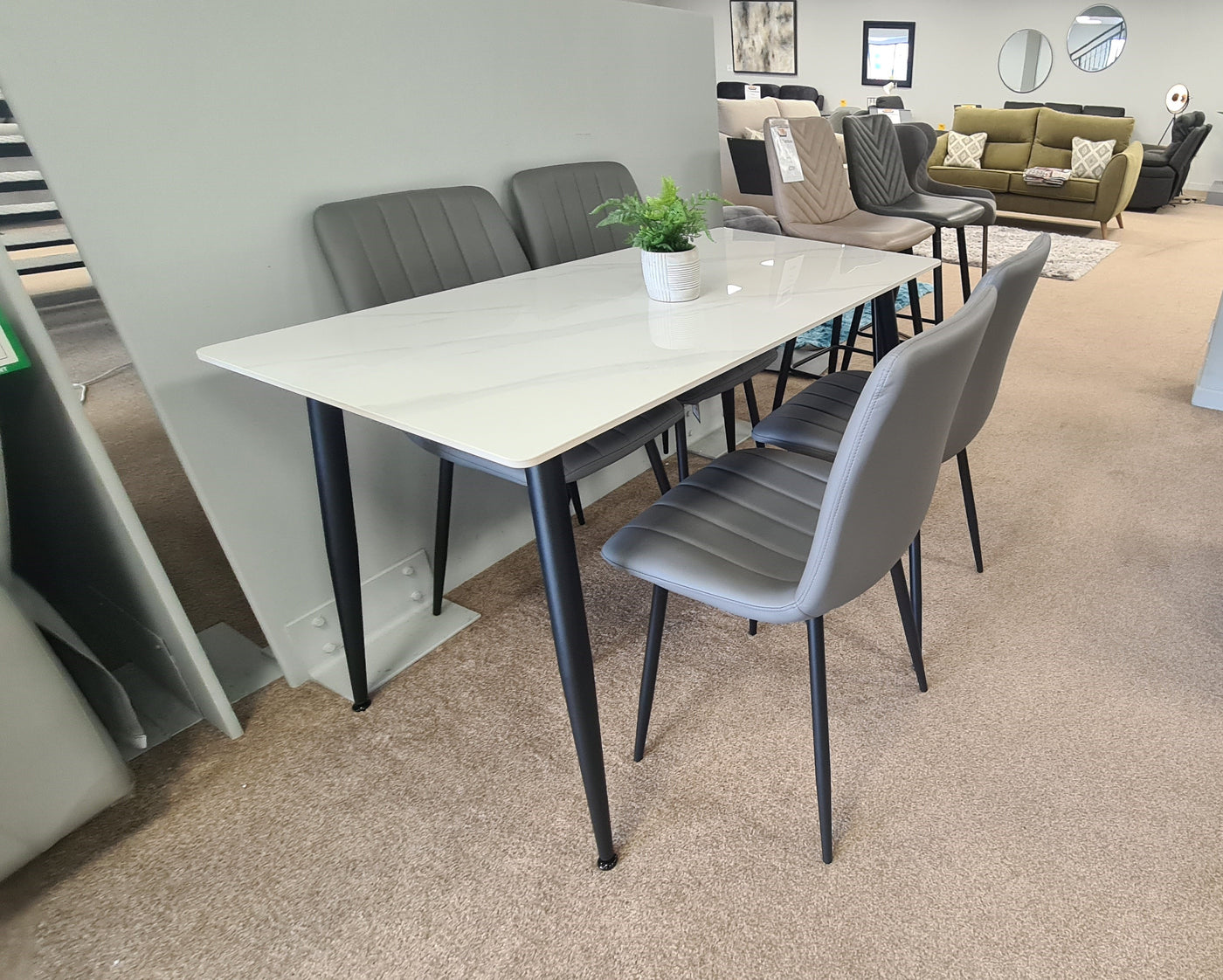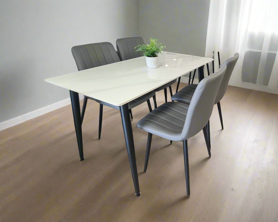 The Christina 5 Piece Dining Set features a 130cm sintered stone table that is both stain and scratch resistant, making it a durable and long-lasting addition to your dining area. The sleek black metal legs add a modern touch, while the wipeable chairs provide easy maintenance and convenience. Enjoy stylish and practical dining with this set.